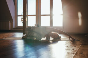 Yogamatten und Hilfsmittel gibt es hier bei mir. Du kannst aber auch gerne deine eigene Matte mitbringen.